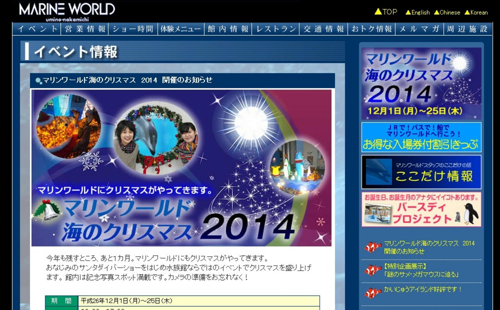 マリンワールドでは、平成26年12月1日(月)から25日(木)にかけて「海のクリスマス2014」を開催されています。