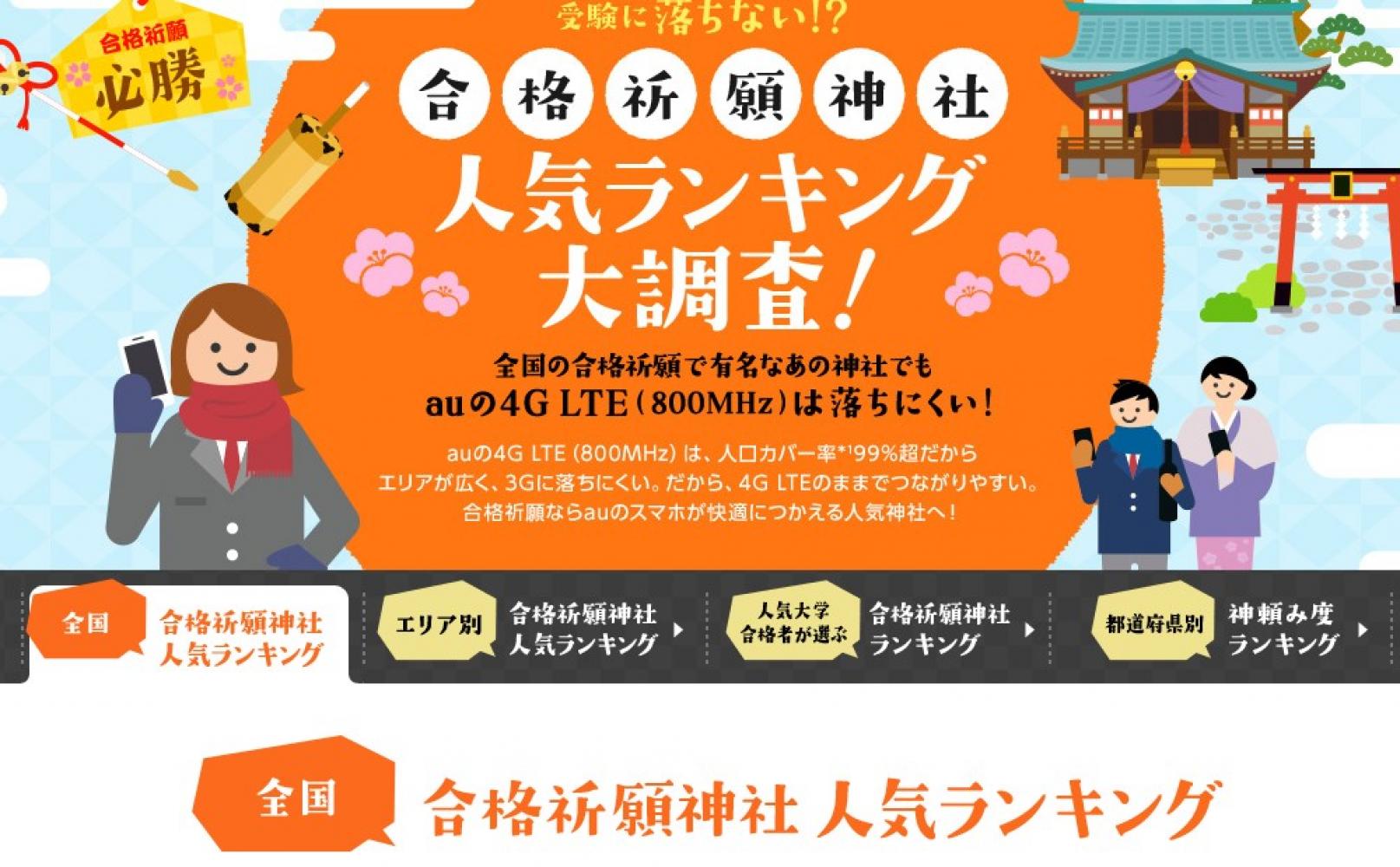 KDDI株式会社が全国の34歳以下の男女30,000名を対象に、合格祈願に関する調査を行ったところ、大宰府天満宮が全国ランキングとエリア別ランキングで1位になりました。