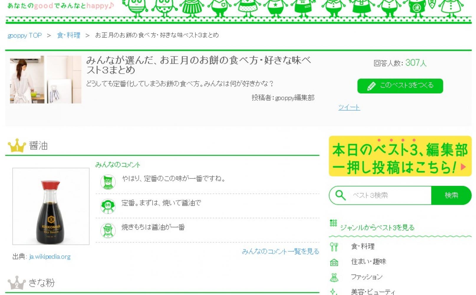 いろんな事をランキングにしてしまうgooppyの、「みんなが選んだ、お正月のお餅の食べ方・好きな味ベスト3」では、醤油味が一番多かったようです。ちなみに2位はきなこ、3位はお雑煮でした。