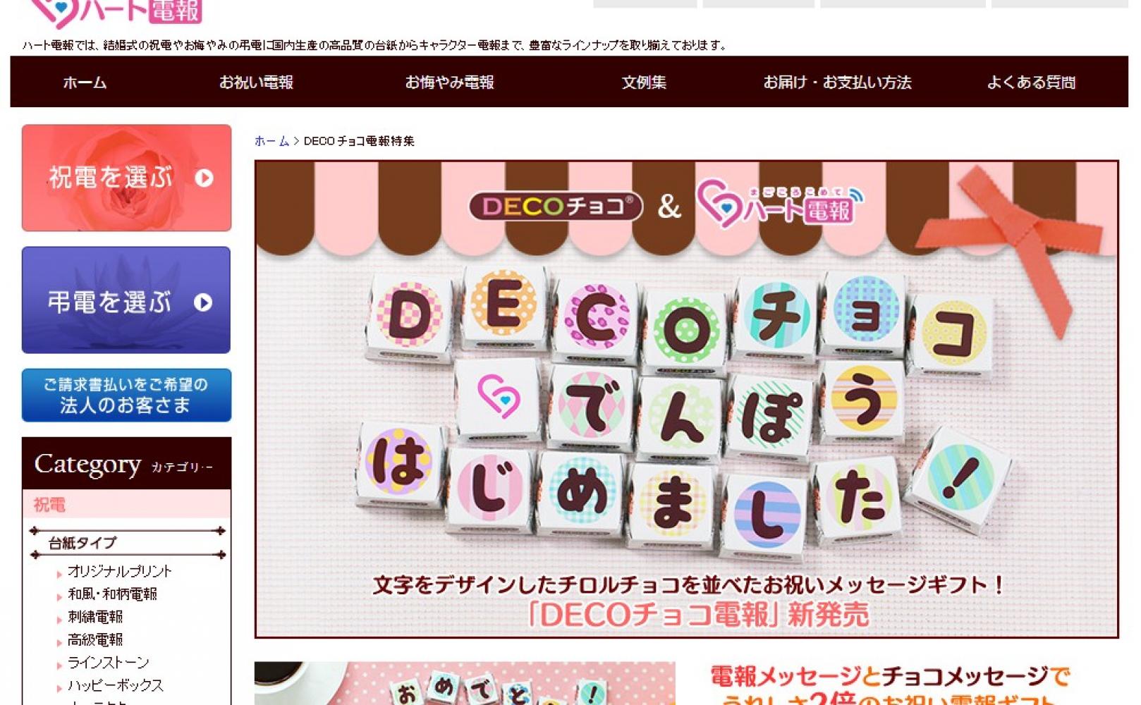 ハート電報は、チロルチョコにオリジナルデザインをプリントした「DECOチョコ」で結婚式や誕生日、そしてバレンタインの定型メッセージを並べたチョコギフトを贈る「DECOチョコ電報」を2015年1月15日よりはじめました。