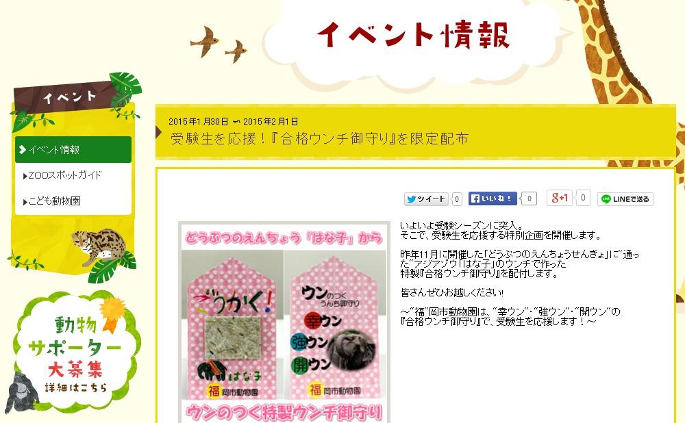 福岡市動物園は受験生を応援する特別企画として、1月30日(金)・31日(土)・2月1日(日) の3日間、特製「合格ウンチ御守り」を数量限定で配布します。