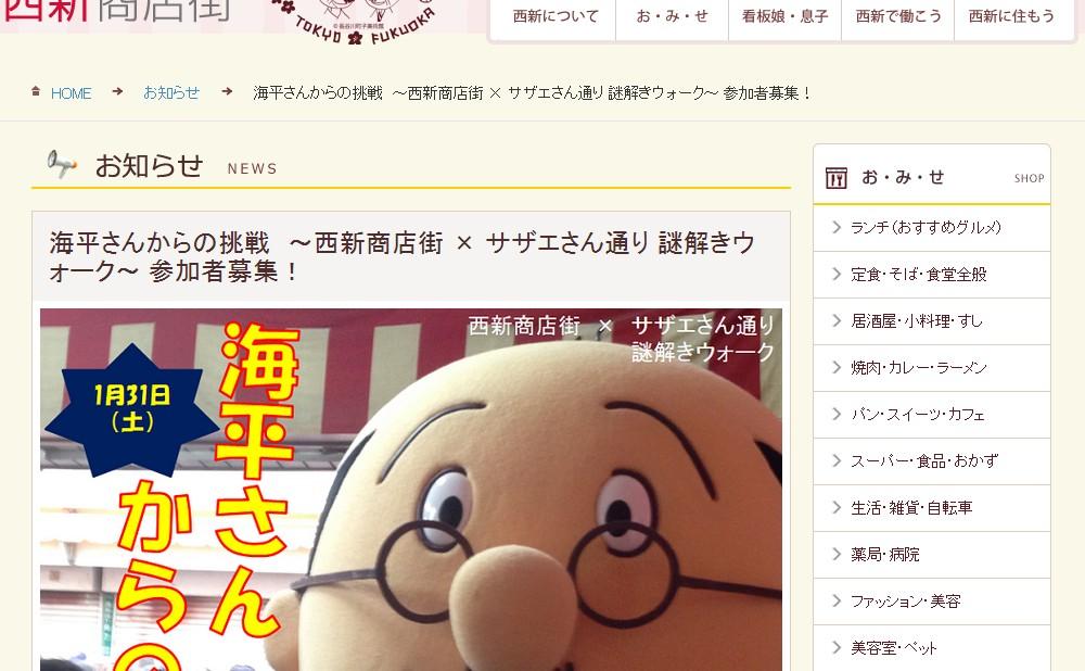 西新商店街は「海平さんからの挑戦 ~西新商店街 × サザエさん通り~ 謎解きウォーク」を1月31日(土)を開催します。