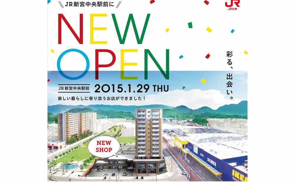 1月29日(木)、JR新宮中央駅前に建設中のマンションMJR新宮中央下層階に、コンビニ、飲食、サービスなどの店舗が同時オープンします(一部店舗は事前にオープン予定)。