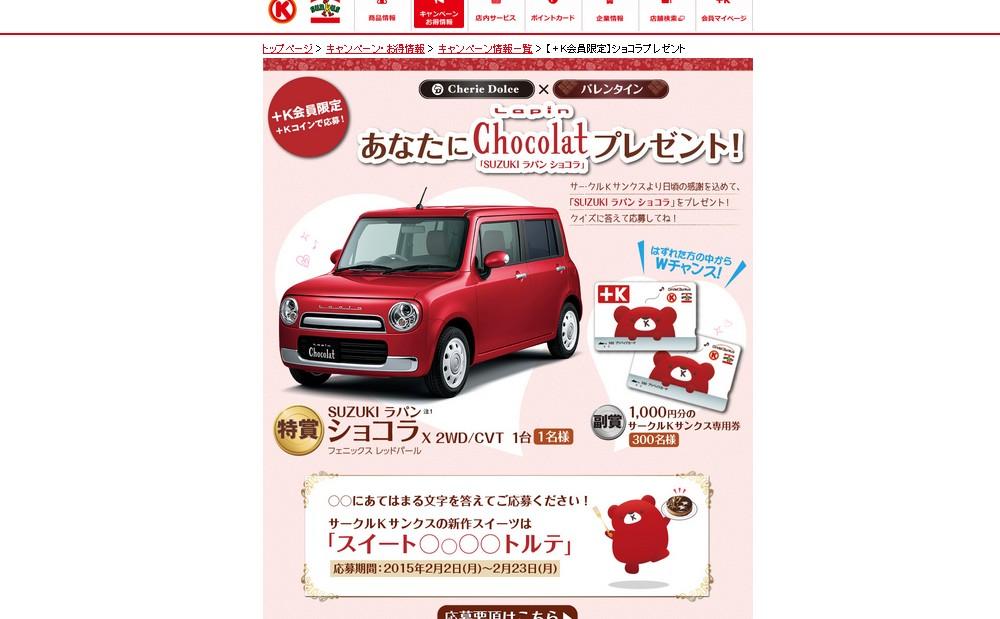 抽選で人気の軽自動車「ラパン ショコラ」をプレゼントするキャンペーンで、Wチャンスで、1,000円分のサークルKサンクス専用券も用意されています。