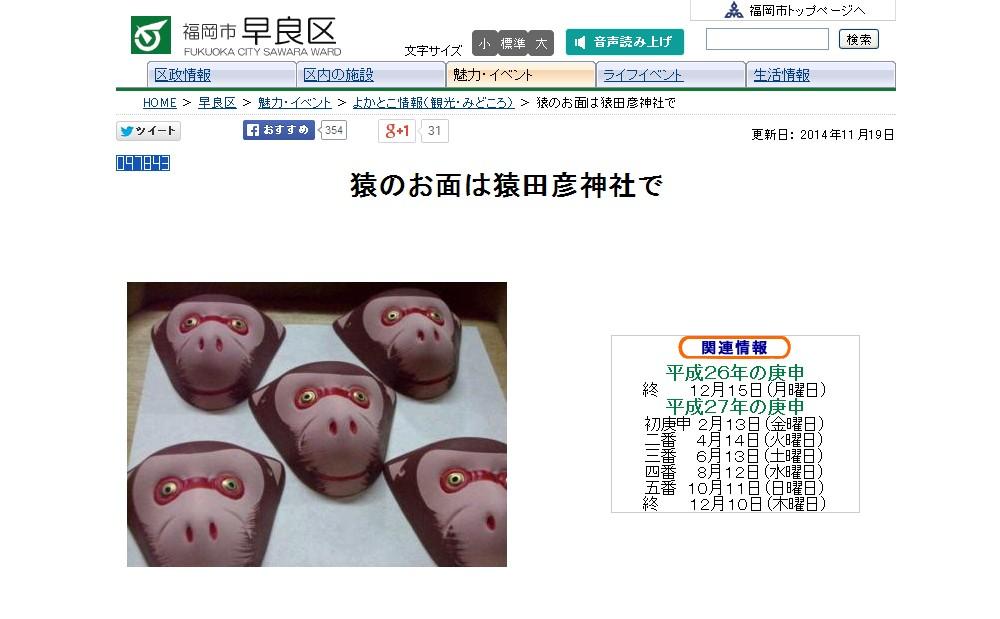 福岡市の一部地域では、猿(さる)が「去る」に通じるとして、「災いが去る」や「幸福が訪れる」ことを願い、このお面を戸口に掛けて縁起をかつぎます。