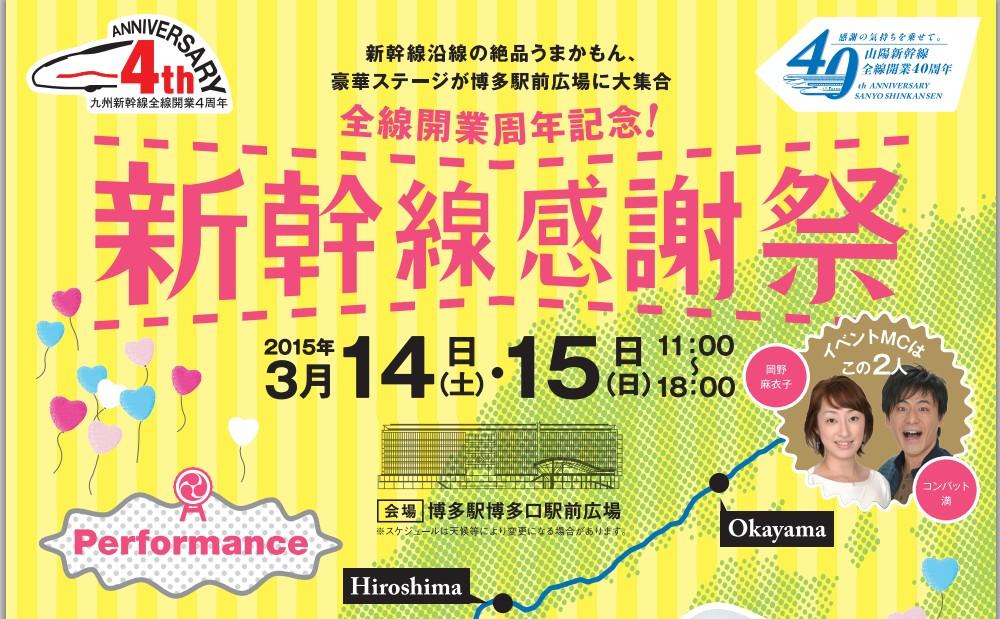「新幹線感謝祭」は、山陽新幹線全線開業40周年と九州新幹線全線開業4周年を記念したイベントで、山陽新幹線・九州新幹線の沿線自治体による観光PRや力強い伝統芸能の披露、グルメ・お土産・観光スポットを紹介・販売する出観光・物産・新幹線PRの特設ブースの出展が行われる予定。