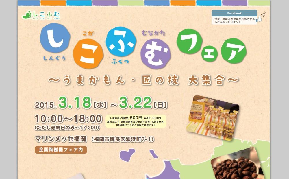 新宮町・古賀市・福津市・宗像市地域の魅力を発信する「しこふむフェア」が、3月18日(水)から、マリンメッセ福岡開催される全国陶磁器フェアにあわせて実施されます。