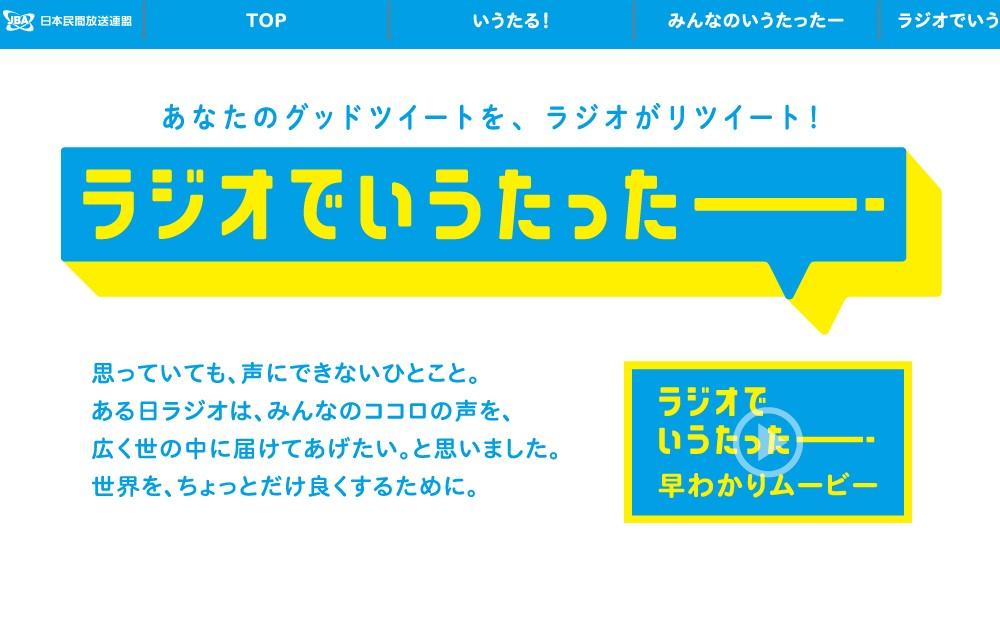 「ラジオでいうたったー」は、みんなが普段思っているけれどなかなか言えない「世の中をよくする」メッセージを、Twitterや専用ウェブサイトを通じて募集し、それをラジオで音声に変換してオンエア(リツイート)するという、ソーシャルプロジェクトです。