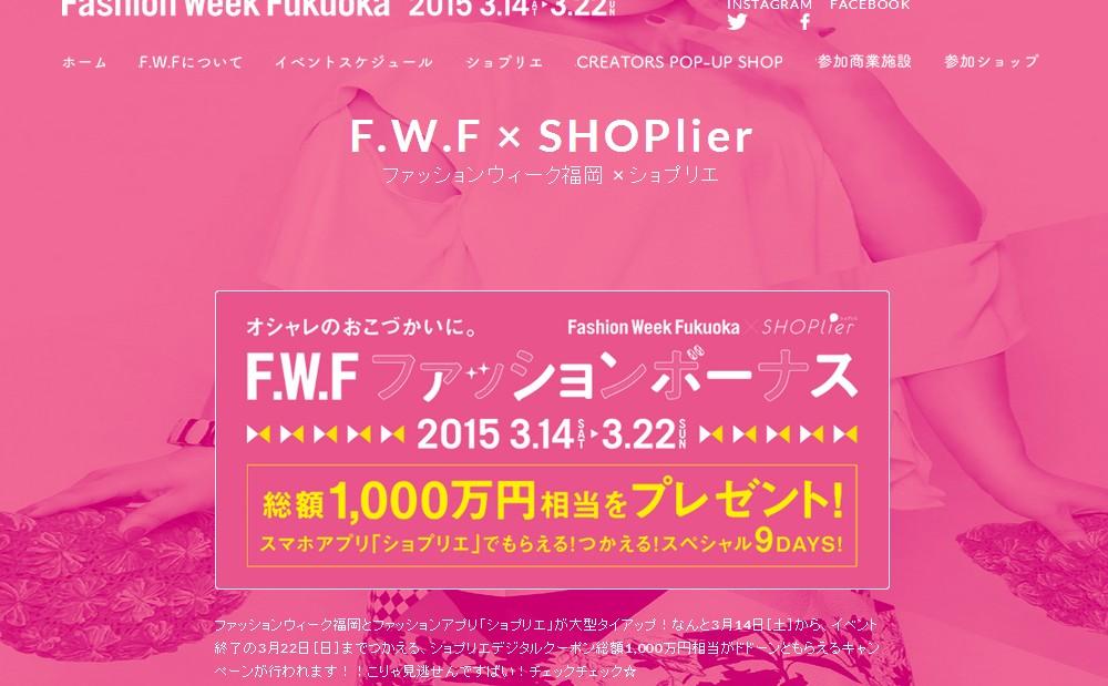 ファッションアプリの「ショプリエ」が、ファッションウィークウィーク福岡(F.W.F)2015に合わせ、ファションボーナスとしてショプリエデジタルクーポン総額1,000万円相当が当たるコラボレーションキャンペーンを実施します。