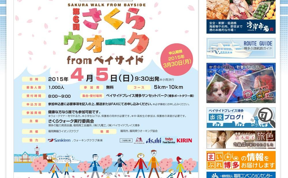 「第6回 さくらウォーク from ベイサイド」は、日本市民スポーツ連盟公認の大会で、春の訪れを感じながら桜の咲く道と歴史ある博多の寺社や町並みを歩いて楽しく健康づくりができる、毎年好評のウォーキングイベント。