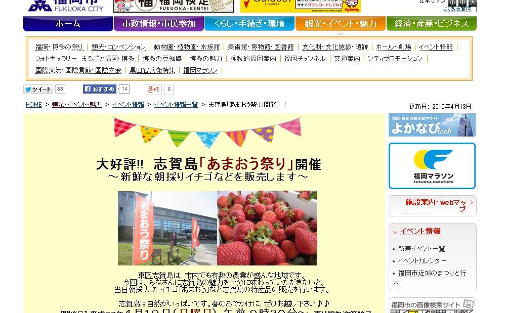 福岡市東区の志賀島の国民休暇村で、新鮮な朝採りイチゴなどを販売する「あまおう祭り」が、4月19日(日)に開催されます。