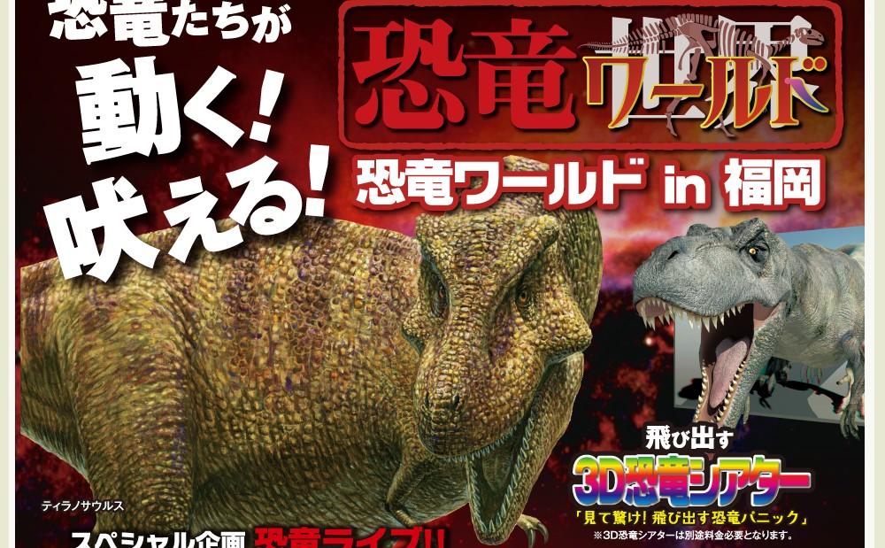 「恐竜ワールド in 福岡」は、映像やライブステージ、発掘などで、恐竜の世界を体験できるイベント。リアルに歩き回る「恐竜体験ライブショー」や3D映像で疑似体験する「3D恐竜シアター」、本物のアンモナイトを使用した本格的な「アンモナイト化石発掘体験」などのイベントがたのしめるほか、恐竜グッズの販売なども行います。