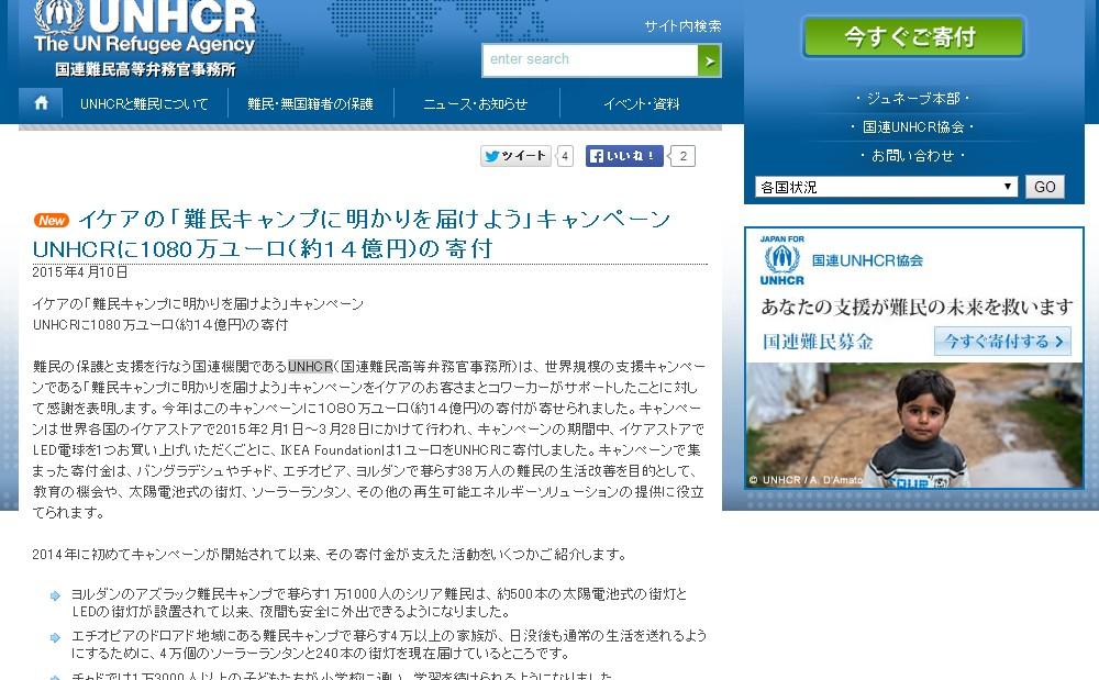 イケアが行っていた「難民キャンプに明かりを届けよう」キャンペーンでUNHCRに1080万ユーロ(約14億円)の寄付が集まったことが発表されました。