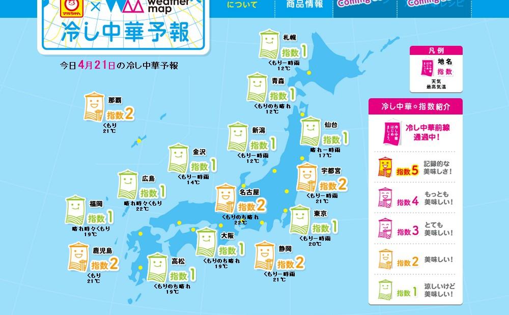 「マルちゃん冷し中華予報」は、チルド麺の冷し中華をはじめとした涼味麺商品のキャンペーンの一環として、東洋水産株式会社と株式会社ウェザーマップがコラボレーションした企画。