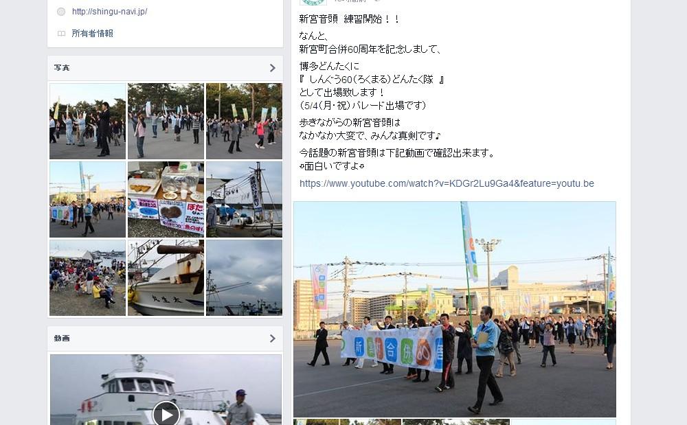 この「新宮音頭」を博多どんたくで踊ることが決定し、「しんぐう60(ろくまる)どんたく隊」が日々練習を重ねている様子も新宮町の関連facebookページ、「しんぐうよかとこ探検隊」で紹介されています。