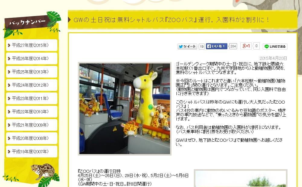 「ZOOバス」の運行日は、4月25日(土)~26日(日)、29日(水・祝)、5月2日(土)~5月6日(水・休)で計8日間で、六本松駅、植物園正門ともに、約15分おきに出発します。