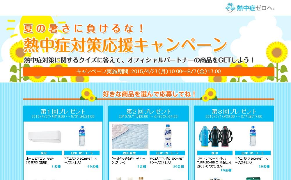 「熱中症対策応援キャンペーン」ページにアクセスして、熱中症対策に関する3問のクイズにチャレンジ。全問正解したら、好きな商品を選んで応募するというやりかたで、各応募期間につき1回チャレンジ可能。最大3回応募のチャンスがあります。