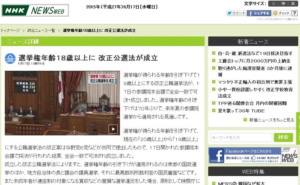 本日17日午前、選挙権の年齢を引き下げる「改正公職選挙法」が参院本会議で可決されました。これにより、施行後初めて公示する国政選挙である2016年夏に実施される参院選から「18歳以上」が投票できる見通し。