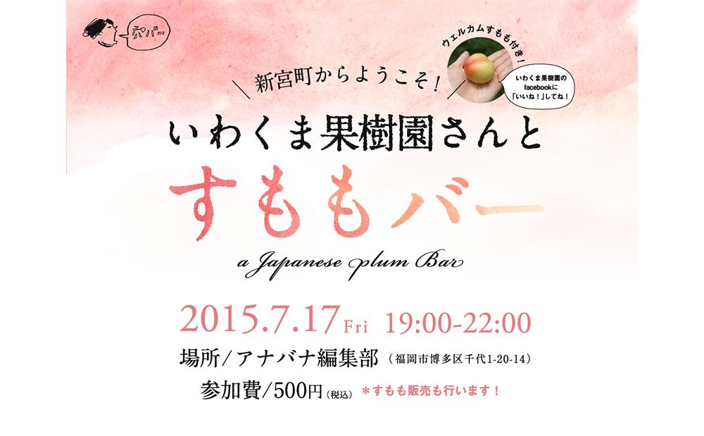 「新宮町からようこそ!いわくま果樹園さんとすももバー」は、WEBマガジン「アナバナ」が主催する臨時のバー「アナバー」の企画として実施されるもので、いわくま果樹園で収穫した新鮮なすももを使った料理やカクテルのほか、岩隈さんトークも楽しめます。