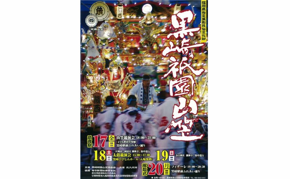 「黒崎祇園山笠」は、春日神社、岡田宮、一宮神社の氏子によって奉納され、福岡県の無形民俗文化財に指定されているお祭りです。関ヶ原の合戦の陣太鼓の勇ましさを祇園囃子に取り入れた黒崎祇園山笠は「けんか山笠」ともいわれていて豪快。