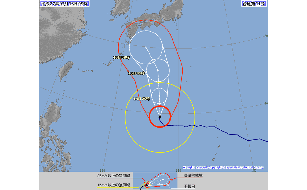 16日の接近時、大型で非常に強い台風になると予想されている台風11号は、現在、日本の南(沖ノ鳥島近海)をゆっくりとした速度で北上しており、中心気圧950hPa、最大風速60m/s(115kt)、今後、徐々に勢力を拡大して日本に接近する見込み。