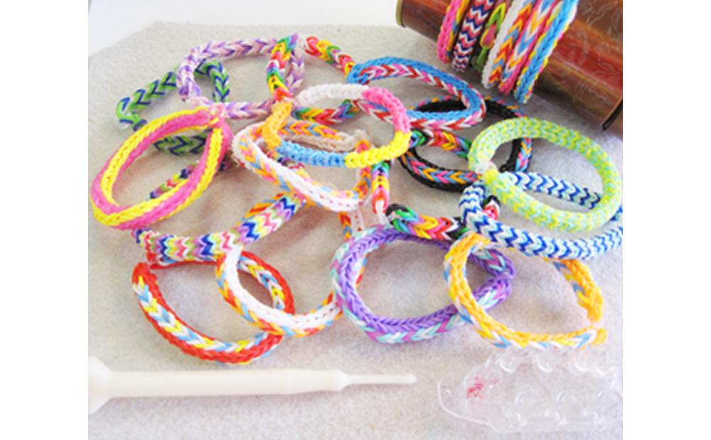 4つのコースがありますが、現在募集が残っているのは「輪ゴムで作るブレスレット!」のみ。専用器具に輪ゴムをひっかけてかぎ針ですくいあげて作るアクセサリーで、自分だけのオリジナルブレスレットが作れます。