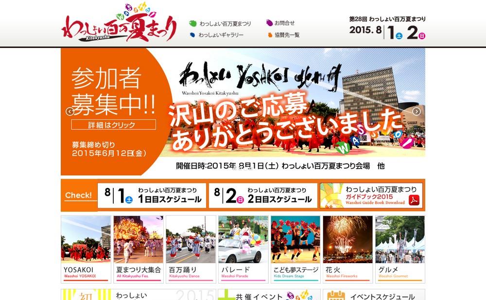 1日目には、「YOSAKOI北九州2015」、「こども夢ステージ ~めざせアイドル~」、などが、2日目には、「パレード2015」、「百万おどり」、「花火大会」などが実施されるなどイベント盛りだくさん。