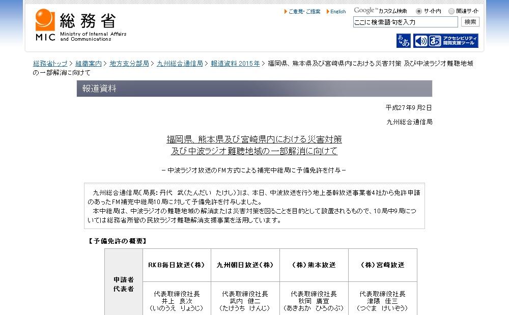 9月2日(水)、総務省九州総合通信局が、中波放送を行う地上基幹放送事業者4社から免許申請のあった福岡の2局を含むFM補完中継局10局に対して予備免許を付与したと発表しました。