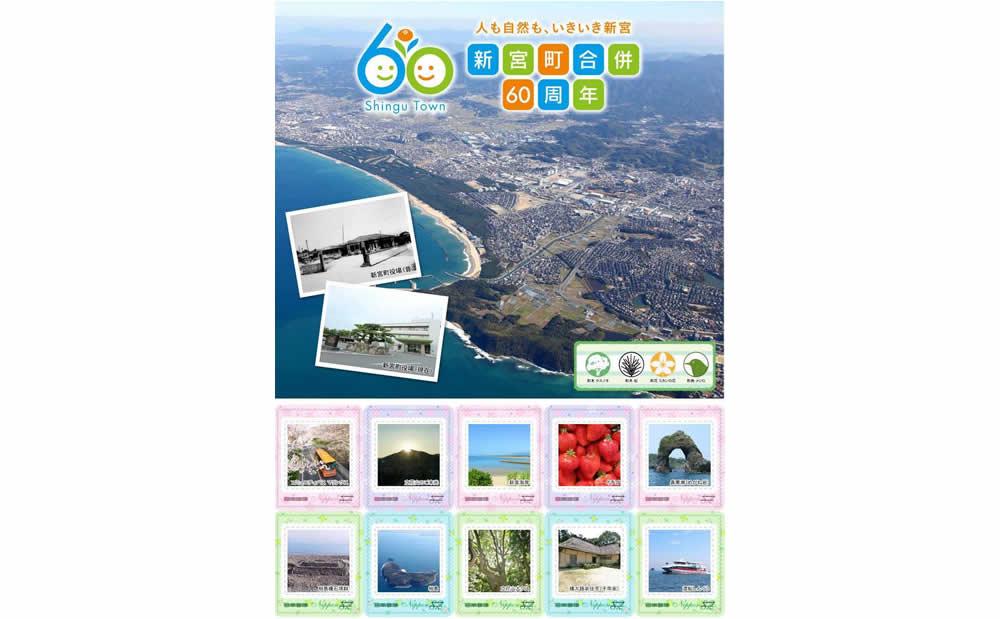 10月13日(火)、郵便局で、新宮町合併60周年を記念した切手シートが発売開始されました。