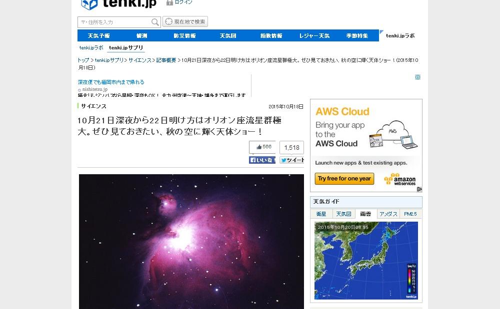 明日10月21日(火)夜から22日(水)明け方にかけて、「オリオン座流星群」が極大となり、観測のピークを迎えます。