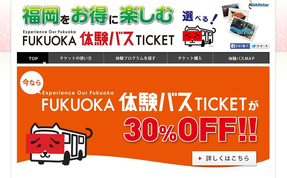 「FUKUOKA 体験バス TICKET」は、グルメや温泉、レジャーといった福岡・博多の文化を楽しむ「体験チケット」2枚と、目的地までの移動に便利な一般路線バスの「福岡都市圏 1日フリー乗車券」または、西鉄電車とバスがエリア限定で乗り放題になる「FUKUOKA 1DAY PASS」をセットにした観光商品。
