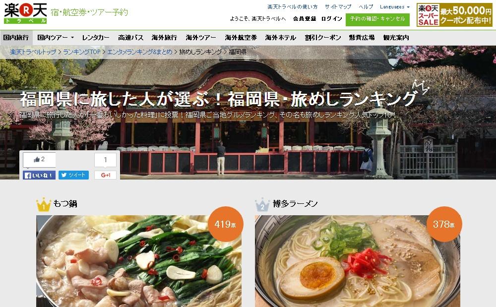 全国の旅めし第40弾となる「福岡県を旅した人が選ぶ!福岡県・旅めしランキング」が旅行サイト楽天トラベルで発表されました。
