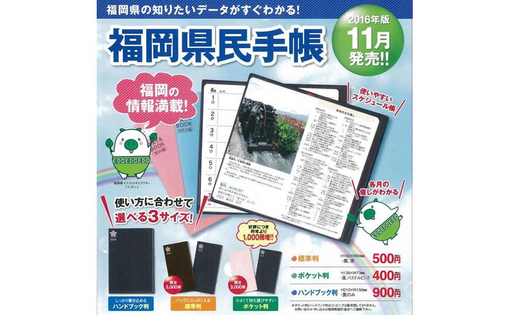 福岡県統計協会が、福岡県の情報満載の手帳「2016年版 福岡県民手帳」を、発売中です。