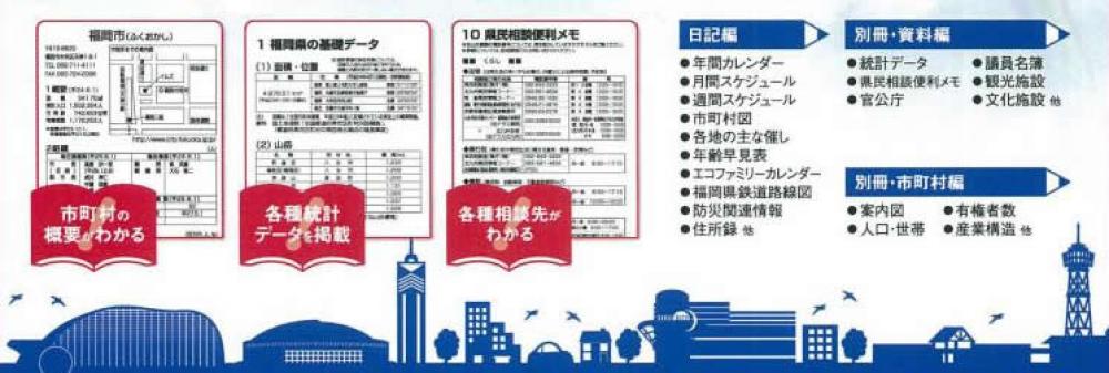 手帳でありながら暮らしにも、ビジネスにも役立つ福岡の情報が満載で、とくに、県内市町村の各月の主な催しが掲載されているのは誰にとっても便利。また、各市町村の主要データが記載された市町村編と、県民相談便利メモ、各種統計データが掲載された資料編の2冊の別冊付録が付属しているのも「県民手帳」ならではです。