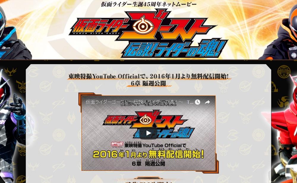 仮面ライダー生誕45周年ネットムービー「仮面ライダーゴースト ~伝説!ライダーの魂!~」は、45年にわたり放送され続けた特撮ヒーロー仮面ライダーの歴史を記念したスペシャルなネットムービーで、2016年1月から、東映YouTube公式チャンネル「東映特撮YouTube Official」にて、「仮面ライダーゴースト」の特別新規映像として、1月15日(金)に配信される第1章「ドライブ編」から3月25日(金)に配信される第6章「ウィザード編」までが隔週で配信されます。