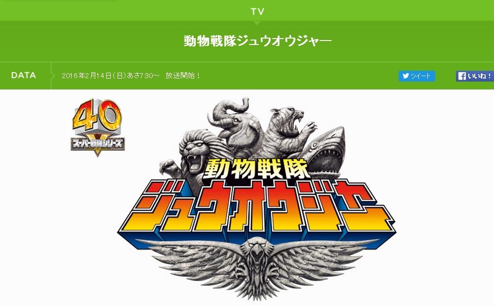 来年放送されるスーパー戦隊シリーズ最新作は「動物戦隊ジュウオウジャー」で2016年2月14日(日)の朝7:30からテレビ朝日系で放送開始されます。