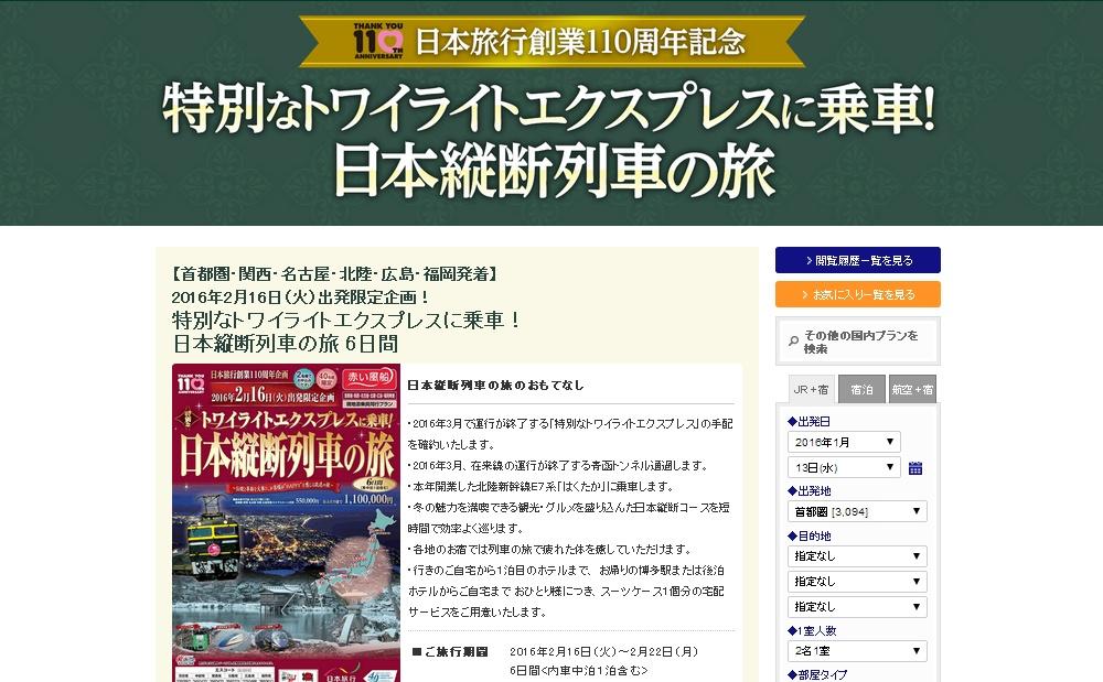「特別なトワイライトエクスプレスに乗車!3日間」は、昨年3月のダイヤ改正で惜しまれつつ廃止になった「トワイライトエクスプレス」の、特に人気が高いスイート、ロイヤルだけで編成された「特別なトワイライトエクスプレス」に乗車するツアーで、同社の創業110周年を記念した商品。