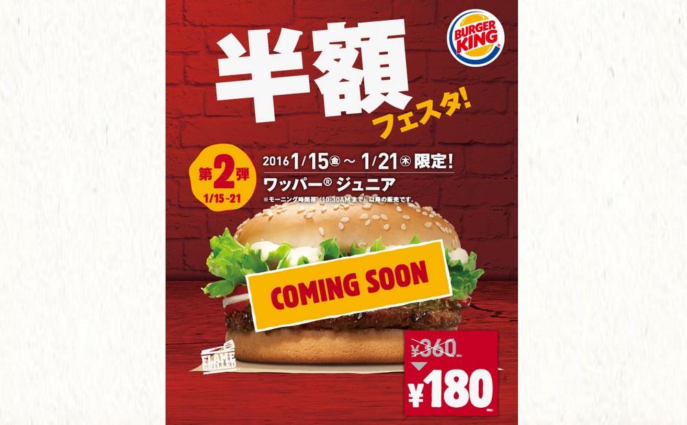 バーガーキングが実施している「半額フェスタ」キャンペーンの第2弾として「ワッパージュニア」を半額で販売するキャンペーンを、1月15日(金)から開始します。