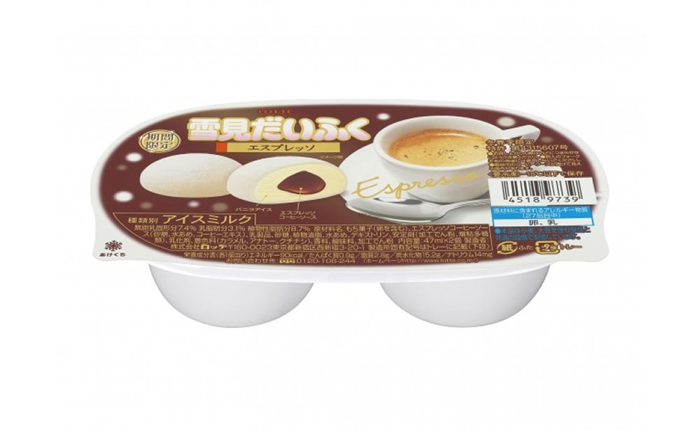 「雪見だいふく エスプレッソ」は、シリーズ初となるエスプレッソ味の雪見だいふくで、ミルクアイスのまん中にエスプレッソコーヒーソースを入れ、雪見だいふく特有の柔らかい白いおもちで包んであります。