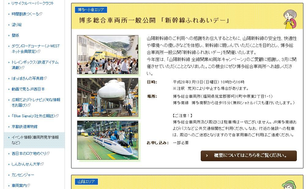 「新幹線ふれあいデー」は、山陽新幹線の安全性、快適性や環境への優しさなどを体感し、新幹線に親しんでもらおうと、博多総合車両所を一般公開するイベント。毎年秋に開催されていましたが、今年は山陽新幹線全線開業40周年キャンペーンなどのため3月に開催となりました。