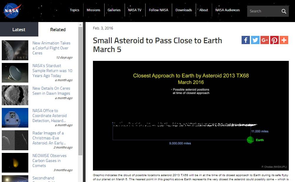 2016年2月3日(水)、アメリカ航空宇宙局(NASA」のトピックスで、3月5日(日)に小惑星が地球に大接近することが伝えられました。