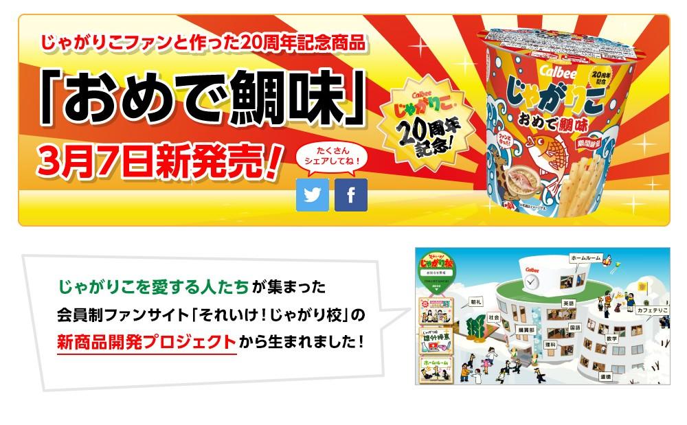「じゃがりこ おめで鯛味」は、会員制ファンサイト「それいけ!じゃがり校」の新商品開発プロジェクトで、1,400案の中から「20周年記念に食べたい味」第1位に選ばれて商品化される新商品。