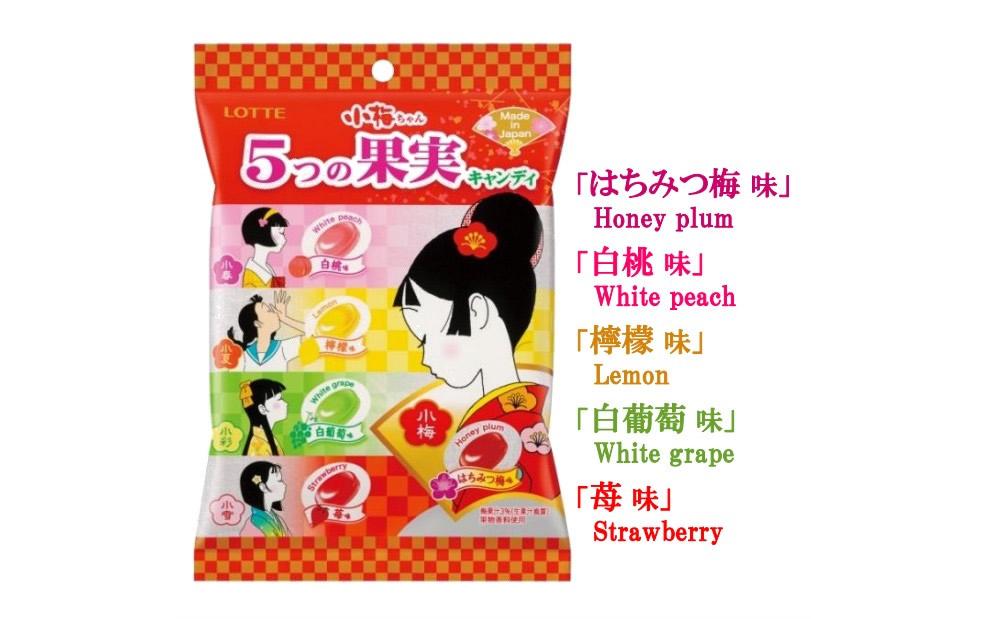 「小梅ちゃん5つの果実キャンディ」は、小梅製品史上初となるアソートキャンディで、小梅ちゃんと4人の従姉妹たちの甘酸っぱい恋をイメージした、5種類のキャンディが入っています。