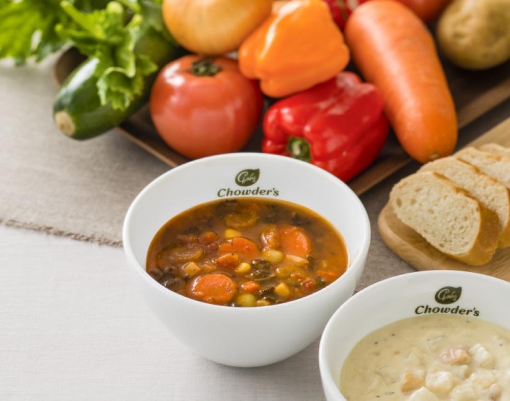 フレッシュなハマグリを使用したチャウダーズの人気商品「ボストン・クラムチャウダー」、具だくさんな「食べるスープ」、飲む野菜サラダの「野菜ポタージュ」など、お家で温めるだけで手軽にお店と同じ味わいが楽しめる冷凍スープ7種をはじめ、トマトとチーズの絶妙なコンビネーションが楽しめる「ローステッド・トマトチャウダー」など、お買い物途中ですぐ食べられる温かいスープも用意されていて、スープはすべてテイスティングが可能。