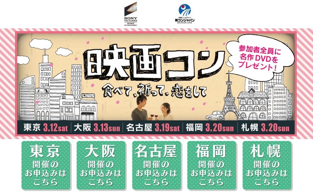 映画とコンパを楽しむ街コンイベント「映画コン ~食べて、祈って、恋をして~」が東京、大阪、名古屋、福岡、札幌の全国5都市で開催されます。