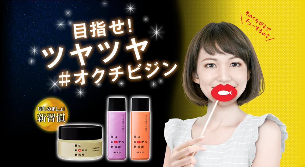 「美はお口から研究所」の商品ラインナップは、「近大マグロ」1尾(約40Kg)からたった約100gしか抽出できない希少な「フルレングス生コラーゲン」を使用した3品で、唇のナイトケア商品「リップスクラブ」1,000円(税別)と、オーラルエチケット成分「ユーカリエキス」「メタリン酸ナトリウム」を配合し、お口ケアを考えたコラーゲンベースの「グミサプリ ミックスベリー」「グミサプリ ピンクグレープフルーツ」各600円(税別)。