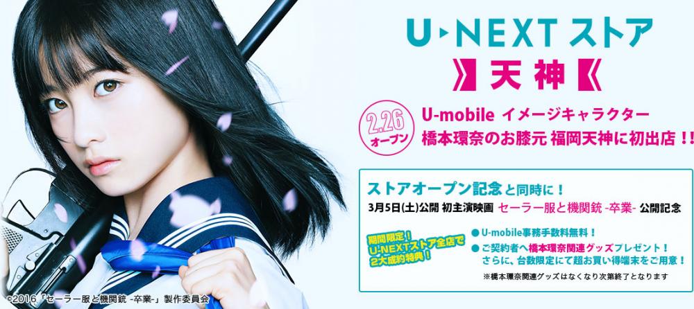 U-mobileのイメージキャラクターは天使すぎるアイドルとして知られる福岡出身の橋本環奈さんで、今回のオープンでは、その橋本環奈さんが初主演となる映画「セーラー服と機関銃 -卒業-」の公開キャンペーンとあわせて記念キャンペーンも実施されます。