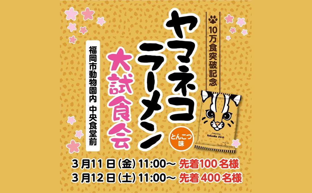 福岡市動物園が販売する、寄付つきのオリジナル商品「ヤマネコラーメン」の全国累計販売数が10万袋を突破したことを記念する大試食会が、2016年3月11日(金)・12日(土)の2日間、福岡市動物園内の中央食堂前で実施されます。