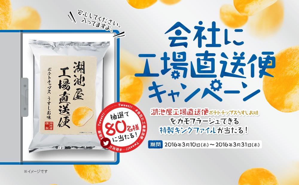 株式会社湖池屋が、オンラインショップで販売している「湖池屋 工場直送便 ポテトチップス うすしお味」の好評をうけて、商品を会社に直接届ける「会社に工場直送便キャンペーン」を実施しています。