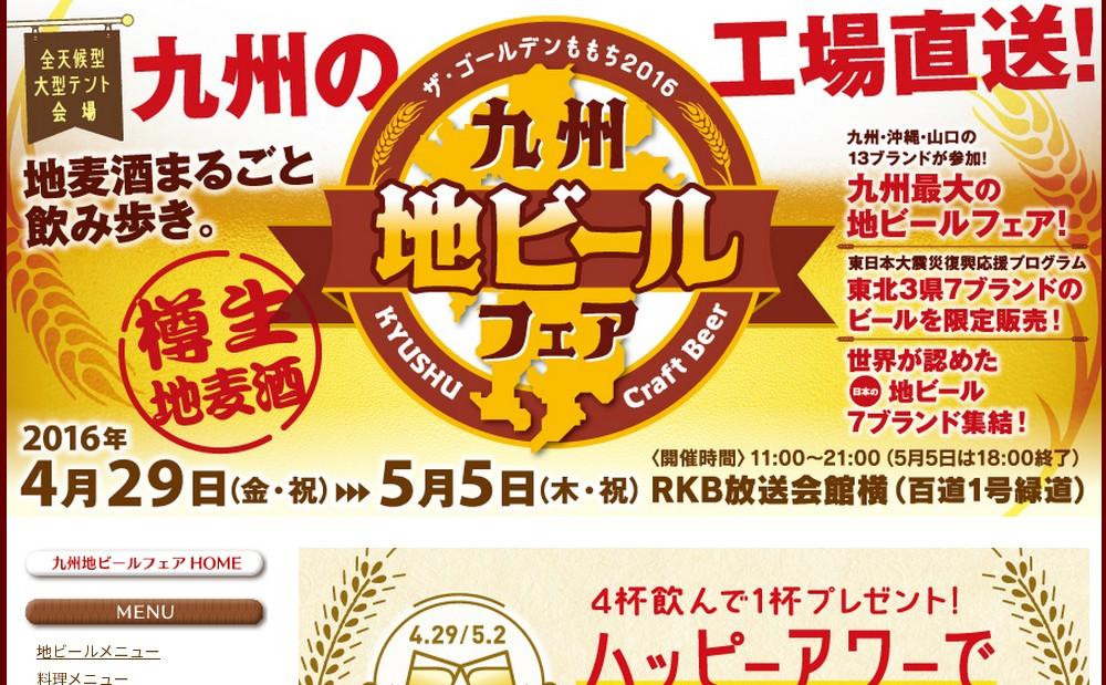 九州の地ビールが集まる、九州最大の地ビールフェア「ザ・ゴールデンももち2016地ビールフェア」が、4月29日(金・祝)から、百地浜のRKB放送会館横で開催されます。